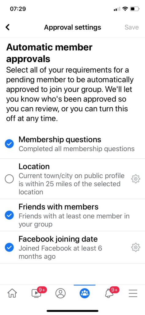 Select all of your requirements for a pending member to be automatically approved to join your group. We’ll let you know who’s been approved so you can review, or you can turn this off at any time.