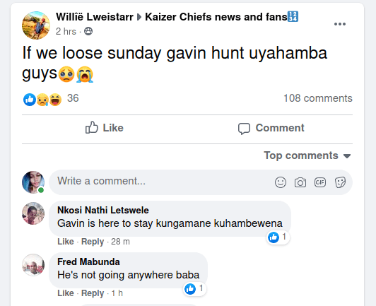 If we lose Sunday Gavin Hunt uyahamba guys. Akaizer Chiefs fan Willîë Lweistarr posted “If we loose Sunday Gavin Hunt uyahamba guys” in a group called Kaizer Chiefs news and fans. Here is his profile click here.